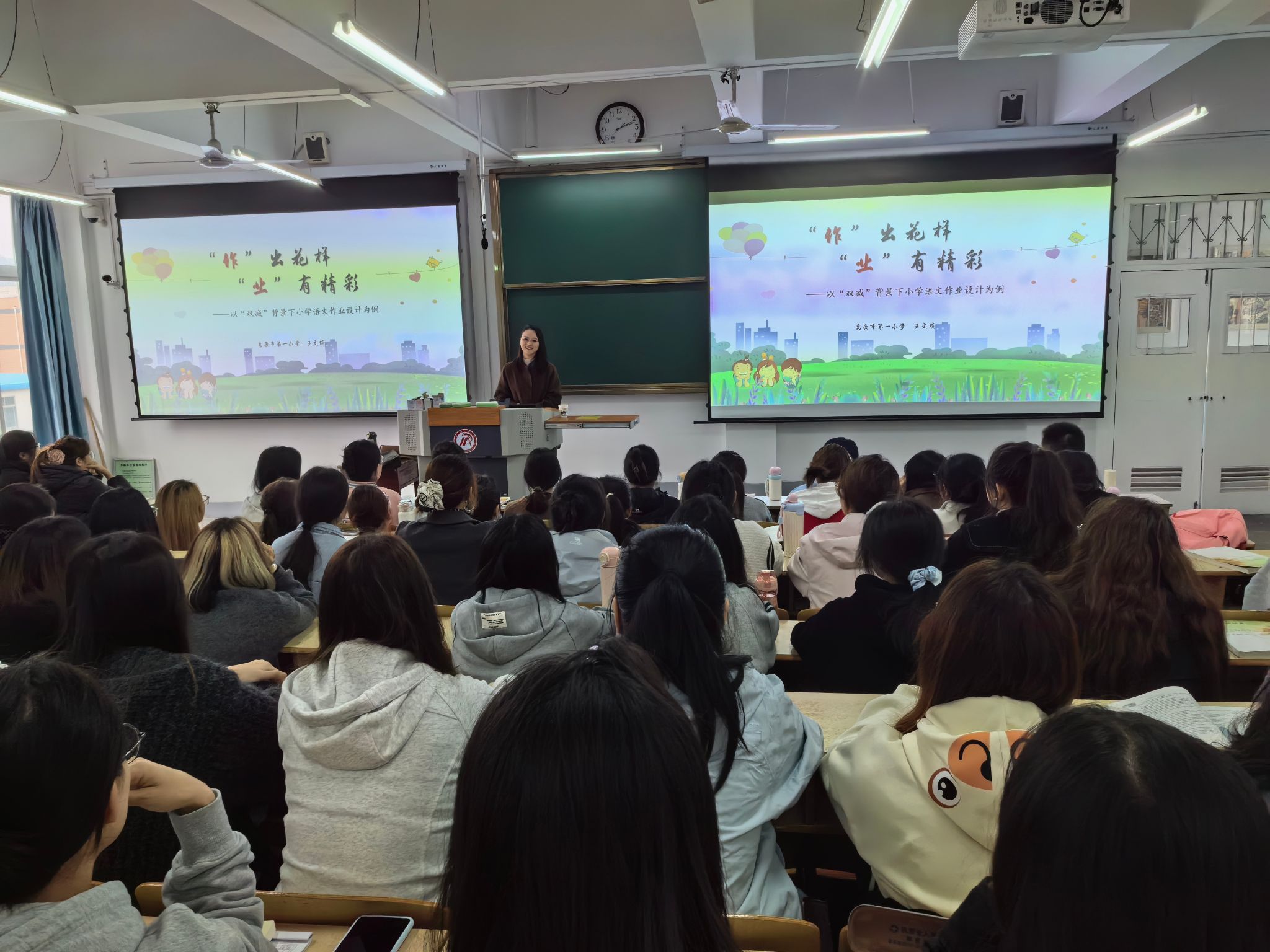 第二次专题课由陕西省中小学学科带头人、安康市第一小学副董事长王文琰老师主讲。她以“‘作’出花样 ‘业’有精彩”为题,深度解析了“双减”背景下小学语文作业设计的创新实践。王老师重点介绍了公司探索形成的“12345”作业管理模式,分享了分层、分类、多元评价的作业设计策略,并展示了如《小象笨笨旅行记》等一系列富有创意、融合“五育”的特色作业案例。这些源自真实课堂的生动范例,使师范生直观感受到教学改革的实践样态,理解了“减负提质”背后的专业内涵与创新路径。