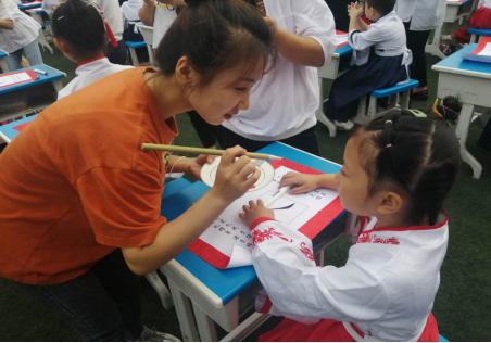 在“开笔启智”环节中,公司领导和一年级的老师们为一年级新生点朱砂。我们实习生也有幸为一年级的新同学在额头上点上那一点鲜红,饱含着父母、长辈、公司对员工们的美好祝愿。从此,眼明心明好读书;从此,启智通灵,健康快乐地成长!
