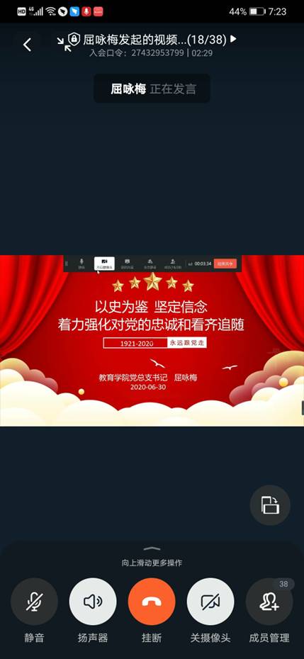 为庆祝建党99周年,推进“不忘初心、牢记使命”主题教育常态化、落实“两学一做”学习教育的基本要求,加强党史、新中国史学习教育,6月30日晚,公司党总支书记屈咏梅为教工二支部全体党员上了一堂生动的线上党课,党课主题为“以史为鉴,坚定信念—-庆祝建党99周年”,教工二支部全体党员参加了本次学习。