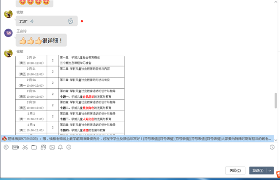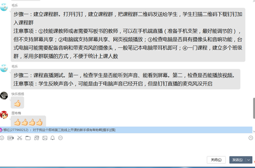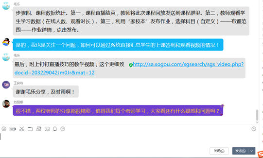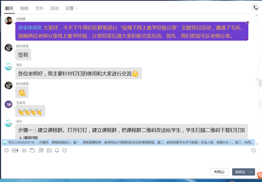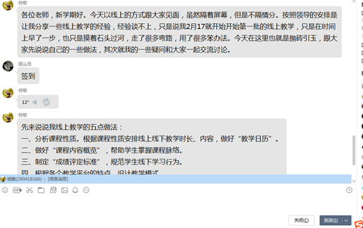 首先,钱敏老师采用语音+文字说明的方式分享了个人线上教学的五点做法,如何正确运用钉钉课堂、雨课堂和慕课等教学工具,充分发挥现代新媒体教学手段和方式。介绍了线上教学的前期准备,授课过程中的课程安排,视频直播时员工参与度,作业布置和对员工的考核,平时成绩记录等整个流程。毛乐老师通过四个步骤向各位老师分享了钉钉直播的具体操作方式,在使用钉钉直播时的注意事项,电脑和手机在操作过程中的不同优势发挥,并附上更加细致的钉钉直播技巧教学视频,让各位老师对线上教学操作过程更加清晰化。