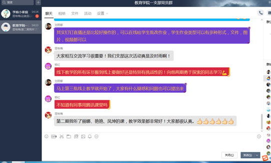 为总结前期疫情防控期间“停课不停学,停课不停教”的线上教学活动经验成果,提升公司教师线上教学水平,同时,给第三批线上教学活动的开展传经送宝,公司教工一支部于4月10日下午两点通过QQ群形式,组织开展了“疫情下线上教学经验分享”主题党日活动。本次活动由教工一支部书记刘丽娜主持,钱敏、毛乐两位老师分享了线上教学经验,全体党员老师参加了本次活动。