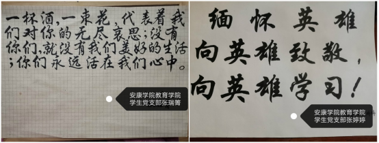 活动在三个平台同时开展:自主祭奠,同学们登录中华英烈网,在人民英雄纪念碑前,为英烈献花,学习英雄事迹,留下感言寄语;发挥专业特长,用书法作品、剪贴画、手抄报、段视频等各类作品表达对英雄的尊敬、书写感言寄语缅怀英雄故人,并在best365中国官方网站员工党支部群、best365中国官方网站班团干部群等QQ群同步分享;利用安康先锋智慧党建平台进行线上讨论,加深思想认识,坚定理想信念。