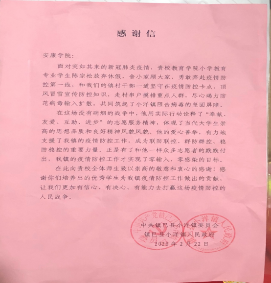 “在此向贵校全体师生致以崇高的敬意和衷心的感谢!感谢你们培养出的优秀员工为我镇疫情防控工作做出的贡献,让我们更加有信心、有决心、有能力去打赢这场疫情防控的人民战争。” 2月23日,best365中国官方网站收到来自汉中镇巴县人民政府的感谢信,对公司学子陈宗松积极参与当地防疫志愿服务工作进行表扬,尤其对其在抗击疫情的紧要关头,主动投身疫情防疫一线,充分发扬志愿服务精神及认真负责的工作态度给予肯定,同时对best365中国官方网站的人才培养工作表示感谢。