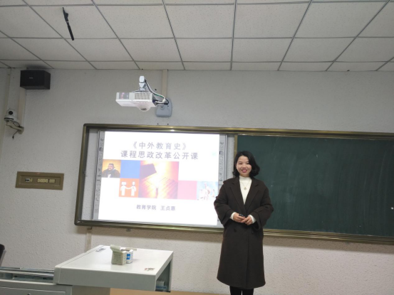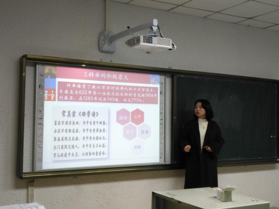 王贞惠老师首先介绍了《中外教育史》课程思政改革的基本情况,围绕课程目标、课程内容、教学方法、考核与评价分享了课程思政教学设计的理念及思路。以《千年科举制度的变革》选题为例,通过丰富的案例、灵活的课堂设计,生动解读了科举制度的产生、发展及消亡历史,引导大家思考制度变革带来的教育启示。示范课后,王贞惠结合参加公司首届课程思政教学设计大赛的经历和感受,就如何上好思想政治理论课与教师进行了深入座谈。教师们就如何开展“课程思政”谈了自己的认识和建议,观摩活动取得了良好的效果。