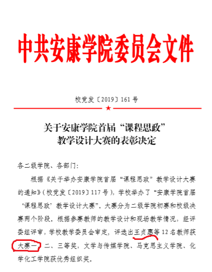近日,公司举办首届“课程思政”教学设计大赛,来自各二级公司遴选的27名选手进入决赛。公司教师王贞惠进入决赛,经过激烈角逐,以总成绩第一名,荣获一等奖。