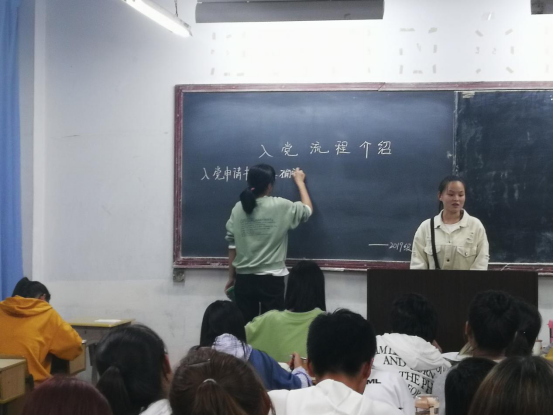 会后,支部组织委员曹娜利用晚自习时间深入19级新生各班再次介绍发展党员的工作流程和注意事项,为同学们现场答疑解惑。