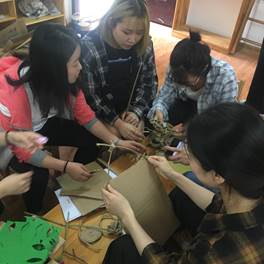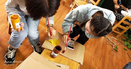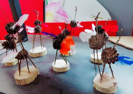 在杨园长与赵主任的安排下,全班同学分为两大组进行实训,一组同学在兰老师的指导下,利用自然材料和废旧材料制作家园联系栏,另一组在赵主任的指导下,利用颜料装饰PUC管,利用自然材料和羽毛制作火烈鸟摆件,利用彩色吸管制作三棱锥、四棱锥。