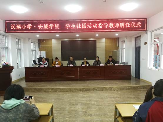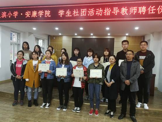 4月2日下午,员工社团活动指导教师聘任仪式在汉滨小学会议室举行。汉滨小学董事长肖静,副董事长梁言和best365中国官方网站学工办主任郇红,小学教育系主任李支其,教师陈佳,以及小学教育专业2016级文科一班、2017级文科一班全体同学参加了活动。聘任仪式由汉滨小学教导处负责人吴仁平主持。