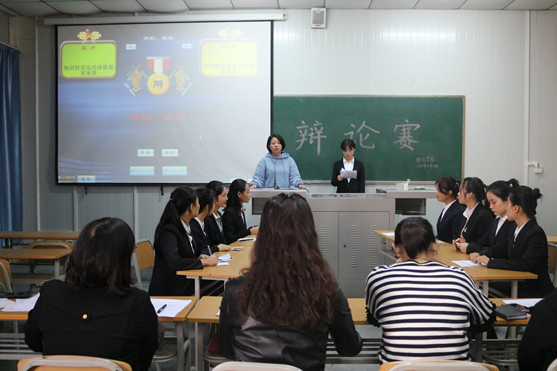 此次辩论围绕讨论“知识扶贫与经济扶贫谁更重要”这一辩题展开,针对当下社会中的现实现象,双方开始了精彩的辩论。首先,主持人介绍了正反方辩手,正方辩手余文文、胡林娜、王雅妮、李欣,反方辩手范雨欣、司鸽、吕洁、马若寒。其次,正反双方分别提出观点辩论,双方的一辩用具有高度概括性的陈述为本场辩论开篇立论,用他们灵活的思维和缜密的逻辑推理击破对手的观点,将辩论赛带入高潮,赢得了场下观众的热烈掌声。比赛进入到了总结陈词的环节,双方辩手分别对辩题进行了最后的总结。王贞惠老师对两方辩手的表现进行了总结评价并给出建议。最后,激烈的对决在老师和同学们热烈的掌声中落下帷幕。