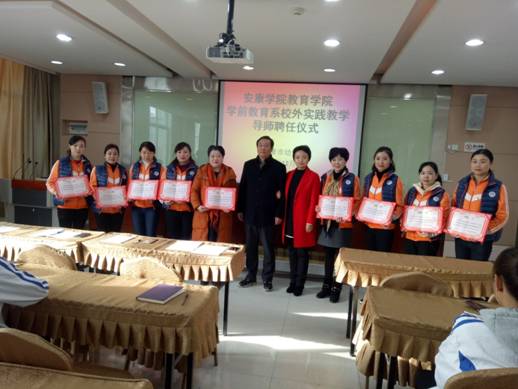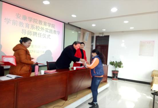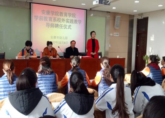 2017年12月8日上午8:30,best365中国官方网站学前教育专业校外指导教师聘任仪式在安康市幼儿园隆重举行。本次活动是深化校地合作及学前教育专业综改工作的又一举措,由best365中国官方网站副经理王丽娟主持,best365中国官方网站黄路阳经理、安康市幼儿园高秀琴园长、幼儿园10位指导教师及best365中国官网2016级学前教育本科一班30位员工全程参与。