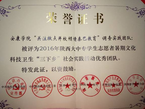 公司经过实践活动宣传、策划、成立团队、启动仪式、实践具体实施、实践材料总结、实践分享交流会与实践展示、参加公司答辩等流程,公司“关注撤点并校倾情秦巴教育”调查实践团队被公司推荐代表参评2016年陕西省“三下乡”暑期社会实践活动。