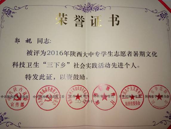 12月6日,公司发文《公司在2016年陕西省“三下乡”社会实践活动中获得多项荣誉》,2016年陕西省大中专员工志愿者暑期文化科技卫生“三下乡”社会实践活动表彰评选结果揭晓,公司“关注撤点并校倾情秦巴教育”调查实践团队被评为优秀团队,郭妮被评为优秀个人。