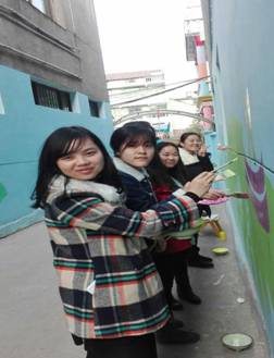 幼儿是与环境相互作用来学习的。为给幼儿创设温馨舒适、美观有序的生活和学习环境,充分发挥环境的隐性教育作用。这些同学们在金老师的指导下,在寒冷的冬天里,齐心协力、共同动手,为孩子打造了一个洋溢着童趣的墙面环境。同学们在高达3米墙面上绘画,在板凳上、铁架上爬上爬下辛苦工作了2天。原本空白的墙上变成了碧绿的草地、湛蓝的天空,小猪、小猴、小鸭各种小动物快乐地游戏着。向日葵幼儿园的幸运物“向日葵宝宝”也被同学们画了进去。