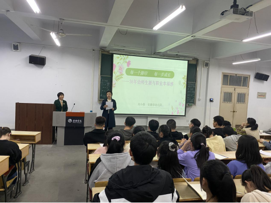 11月3日晚七点,安康市幼儿园刘小燕副园长应邀在多媒体教室1510做了题为“36年幼师生涯与职业幸福感”的学术讲座。讲座由学前专业负责人王丽娟主持,best365中国官方网站经理王刚、学前教育专业系主任刘丽娜、姜凤坤、钱敏等10多位教师以及2020级学前专业80多名新生共同聆听了此次讲座。