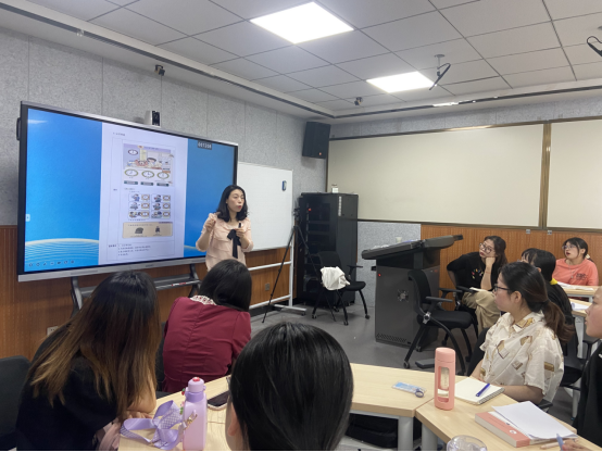 2022.6.1.培新小学教导主任范莉老师在4204给员工带来课题-精准解读教材,助力课堂教学。结合双减政策如何提高课堂教学质量,从研读课标、诵读教材、细读教材、读懂教材全方位分析教材,并结合丰富案例(通分、用字母表示数、运算定律、三角形内角和、3的倍数特征、圆的认识、用字母表示数等)和直观教具进行现场示范教学。员工们听课非常认真,下课后都不愿离去,向范师请教探讨。