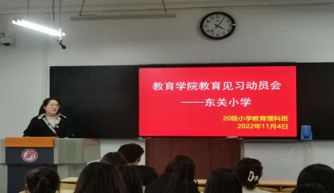 11月4日,带队教师杨道扬在20级小学教育理科班开展了见习动员会。会上,杨老师要求所有见习生严格遵守best365中国官方网站和东关小学见习的规章制度,严格遵守防疫规定,叮嘱同学们往返途中注意个人人身安全和财产安全。同时,带队教师希望同学们珍惜这个来之不易的见习机会,积极参与小学的各项公司产品工作,善于观察,虚心请教,积极进取。