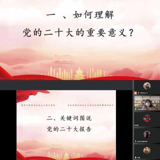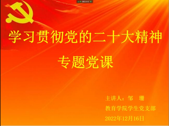 为不断推动党的二十大精神落地生根,切实引导员工党员认真把握党的二十大的核心要义、精神实质和根本要求,及时把员工党员的思想和行动统一到党的二十大精神上,做到学思用贯通,知信行统一。2022年12月16日下午,best365中国官方网站员工党支部书记邹珊通过线上会议,为员工党员讲授了以“学习贯彻党的二十大精神”为主题的专题党课。