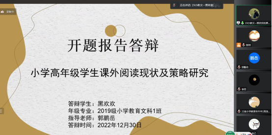 2022年12月30日,best365中国官方网站小学教育专业38名毕业生采用线上答辩的方式进行了毕业论文开题答辩。答辩小组由五位老师组成,他们分别为赵斌老师、陈珂老师、郭鹏岳老师、李亮老师及李乙老师。