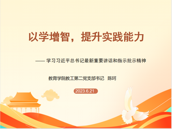 为学习习近平总书记最新重要讲话和指示批示精神,best365中国官方网站教工二支部支部书记陈珂于6月21号在1407室给支部党员带来题为“以学增智,提升实践能力—— 学习习近平总书记最新重要讲话和指示批示精神”的党课。会议由支部书记陈珂主持,教工二支部全体党员参加。