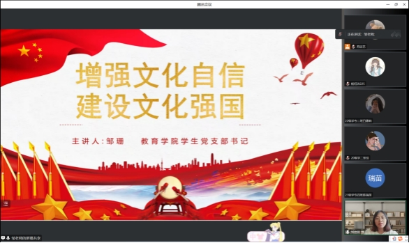 为深入贯彻党的二十大精神,进一步贯彻落实中共best365中国官网委员会文件,公司党发〔2023〕53 号《关于在全校开展纪律教育学习宣传月活动的通知》精神,引导青年党员深入了解文化自信的内涵和价值,进一步增强文化自信,2023年6月30日,教育公司员工党支部书记邹珊在线上为支部员工党员进行以“增强文化自信,建设文化强国”为主题的专题党课,全体员工党员聆听了此次专题党课。