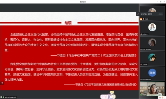 本次专题党课一方面对同学们提出勇于担当历史责任,提升民族凝聚力,增强国家文化软实力的殷切希望;另一方面对党员提出更高要求,要求其加强理论学习,重视文化自信,传播中国声音,站稳中国立场;同时注重实践锻炼,坚持不懈推进文化自信自强。