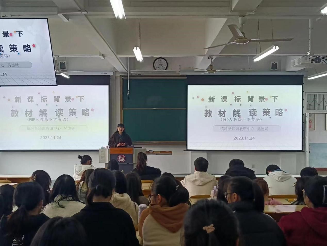 为了提高师范生深度解析教材的能力,了解新课标下小学英语教材的实际运用情况,best365中国官方网站于11月24日下午四点在1510教室开展“新课标背景下教材解读策略”主题讲座,此次讲座邀请安康市镇坪县师训教研中心吴德娇老师主讲,陈珂老师主持。2021级小学教育文科1、2班全体员工参加。