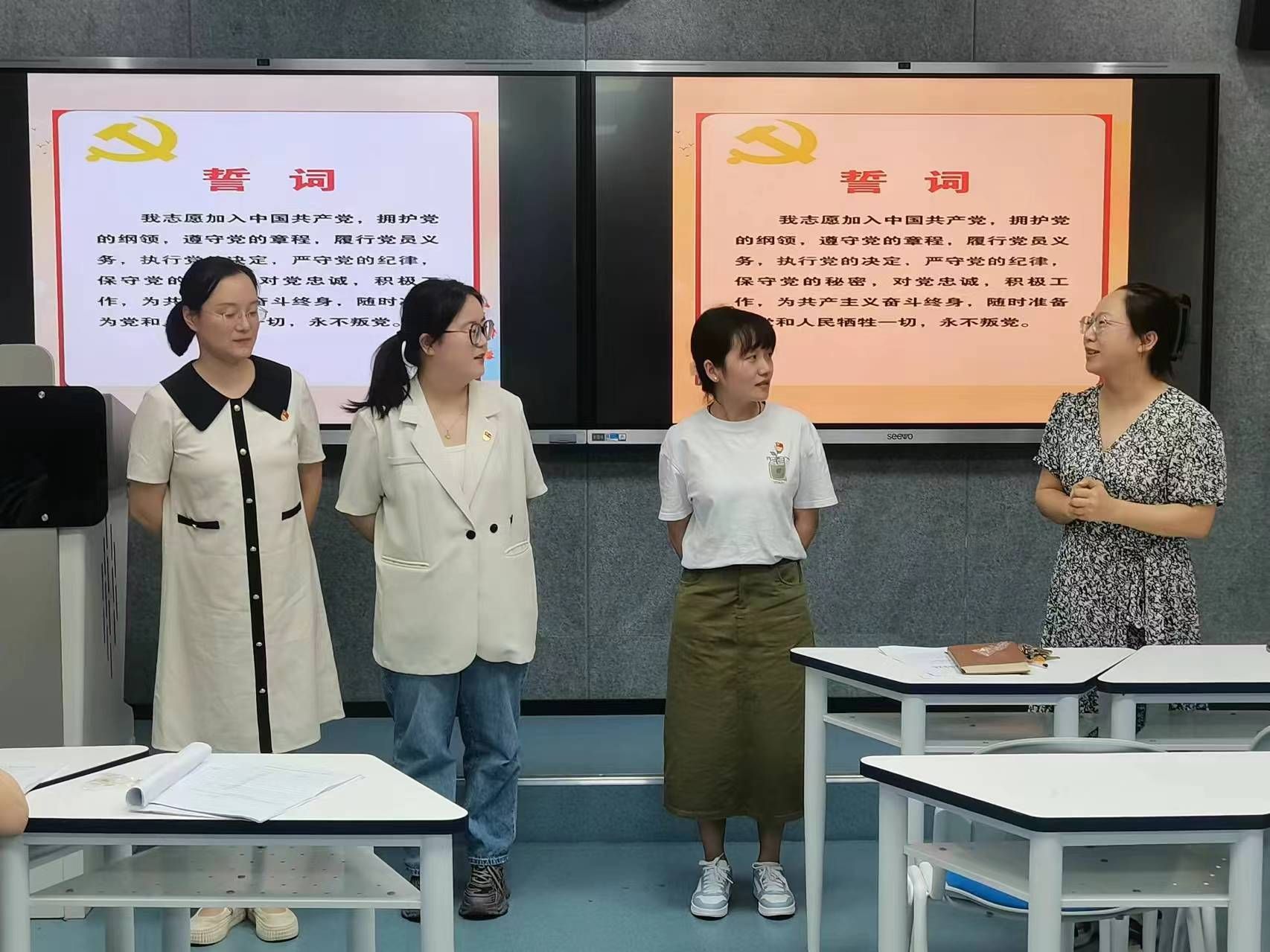 张蕾、钱悦、杨道杨三位青年教师,自参加工作以来积极向党组织靠拢,参加政治理论学习,系统地学习新党章和党的路线方针政策,不断加深对党的认识,经培养联系人推荐、支部大会表决,三位同志于2024年1月5日被党组织吸纳,光荣成为中国共产党预备党员。在“七一”即将来临之际,教工二支部全体党员同志作为见证人,见证了三位同志面向党旗宣誓的庄严时刻。