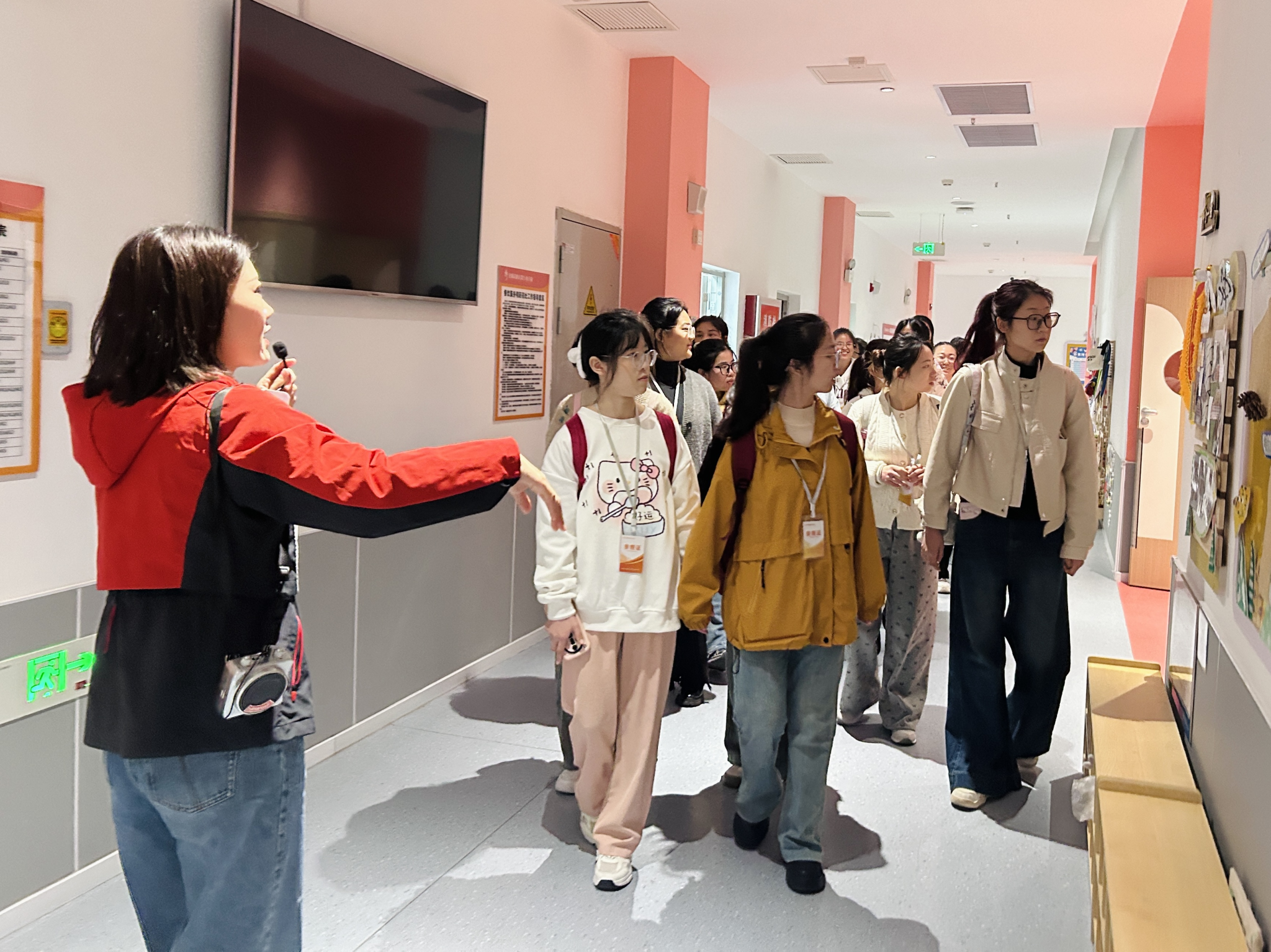 周一上午八点半,同学们佩戴参观证有序入园,在幼儿园徐丹老师的热情带领下,同学们参观了幼儿园。从温馨可爱的教室布置,到设施齐全的活动场地,每一处都彰显着幼儿园对孩子们成长的用心。通过老师的讲解同学们了解到园所的理念是:过快乐而有意义的童年。还有园所独有的”九幼城”微社会体验室,从幼儿的需要出发,为激发他们想象力与创造力提供了一个平台。