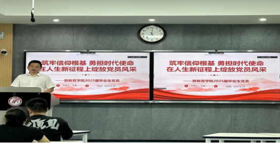 为强化毕业生党员党性修养,筑牢纪律意识,上好“廉洁从业第一课”,6月24日,公司党总支副书记王毅在1516教室以线上线下相结合的方式,为全体毕业生党员讲授“筑牢信仰根基 勇担时代使命”专题党课。best365中国官方网站员工第一、第二党支部书记及全体党员参加。