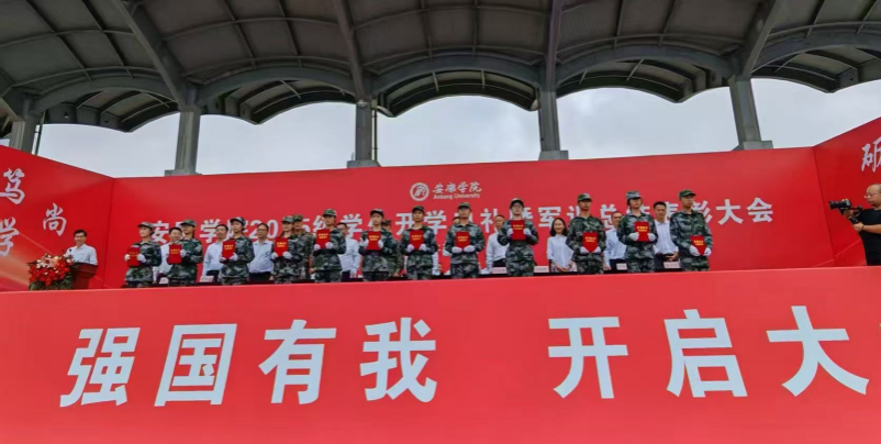 2025级学前教育专业麻帅华在军训总结表彰大会上发出“家国情怀”“理想航向”“本领淬炼”三项约定,代表全体新生宣誓:“请党放心,强国有我!”