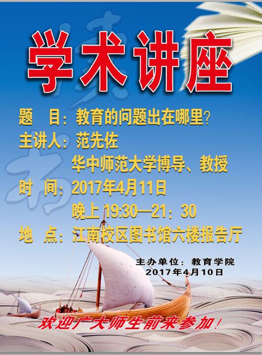 公司特邀请国家教育专家—华中师范大学博导范先佐教授来公司做讲座,时间:2017年4月11日晚上19:30,在公司江南校区图书馆六楼报告厅举行,届时请各位老师光临讲座现场。