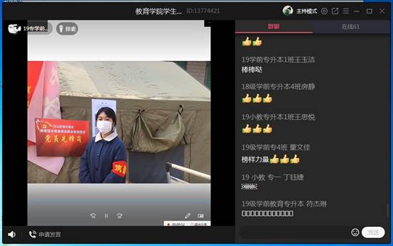高标准,严要求:郑雪在视频中为大家分享了自己在疫情期间所做的卡点执勤服务经历,疫情宅家期间,利用空闲之余发展培养自己的兴趣爱好。视频中她谈到;“身为一名党员,我时刻严格要求自己,永葆共产党员的先进性,克服庸懒散软思想,扎实学习,从一点一滴做起做起,积极参加院系组织的各类线上活动,有强烈的自觉意识和责任意识。”