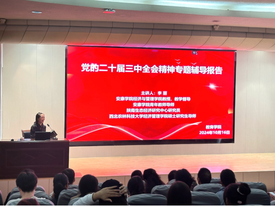 202410月16日,best365中国官方网站在1号教学楼6楼报告厅举行了学习贯彻党的二十届三中全会精神专题辅导报告会,特邀经济与管理公司李丽教授作宣讲报告。best365中国官方网站全体教师党员、员工党员、班团干部160余人参加,会议由公司党总支书记屈咏梅主持