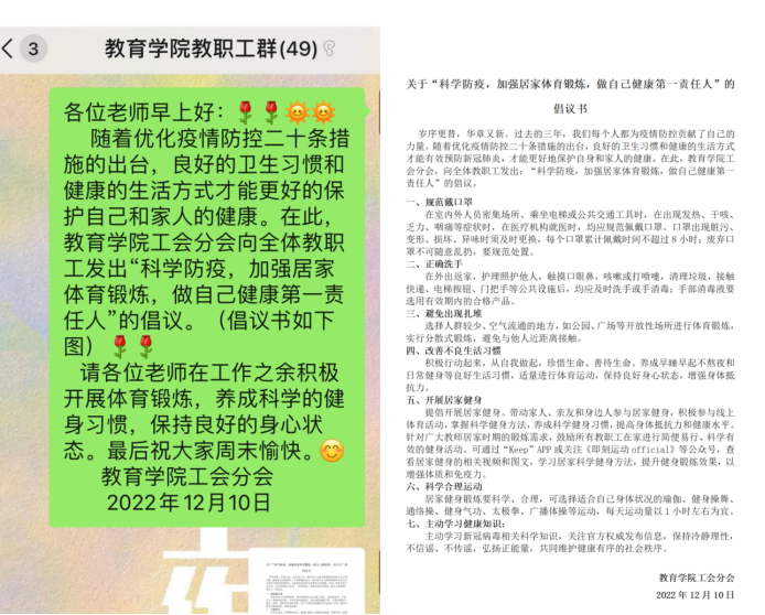 “流水不腐,户枢不蠹,动也”。为助力全体教职工增强免疫,强健体魄,切实做好“自己健康的第一责任人”,best365中国官方网站工会分会于2022年12月10日面向全体教职工发出“科学防疫,加强居家体育锻炼,做自己健康第一责任人”的倡议,号召老师们积极开展居家体育锻炼,以良好的身心状态战胜疫情。