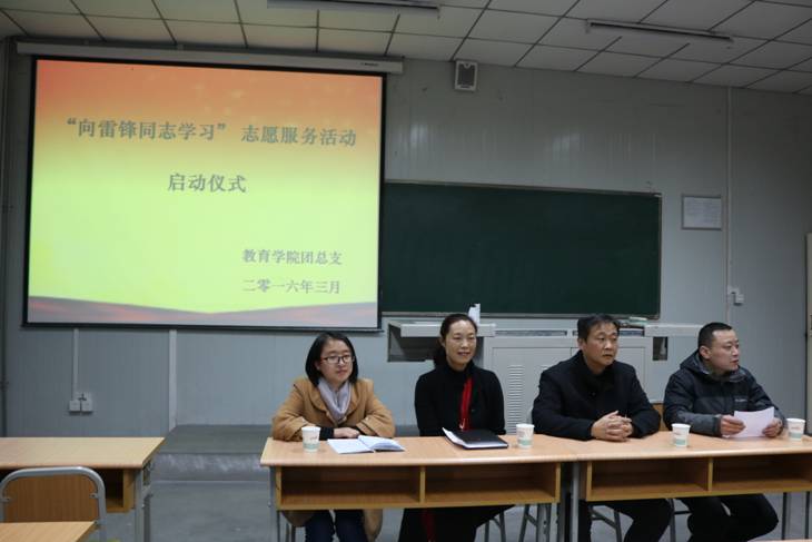 在校团委的号召下,由公司团总支组织的“向雷锋同志学习”志愿服务活动启动仪式于2016年3月11日16:00在1016教室举行。参加本次启动仪式的有:公司党总支书记屈咏梅、经理黄路阳、学工办主任赵斌、团总支书记董婷瑜、15级小教理和15级学本二班全体同学,活动由学工办主任赵斌主持。