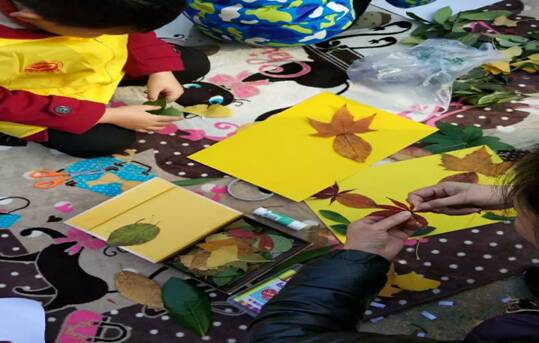 游戏做完后,在家长的带领下小天使们去公园的深处捡拾到了各种各样的树叶,为作画做准备。孩子们都回来后,徐老师指导性的讲述了《落叶跳舞》的故事,可是孩子们已经迫不及待的做起了树叶画,老师的故事似乎变成了陪衬。孩子们比我们想象的还要棒,他们在自己的想象力中自由翱翔!看,多么生动而温馨的一副画啊,妈妈和宝贝站在棕榈树下静静的望着大海深处,我都被感动了!