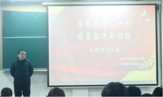 赛后,赵斌做了总结发言,对参赛者给予点评和鼓励,要求同学们把对二十大精神学习贯穿于自己的思想学习、生活实践中,在二十大精神的指引下,唱响时代主旋律,用青春之光点亮人生梦想,不辜负时代对青年的期许和厚望,做有理想、敢担当、能吃苦、肯奋斗的新时代好青年。