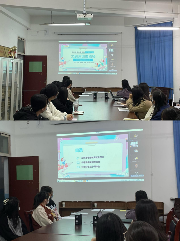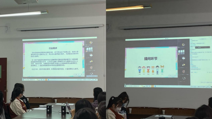 宣讲会上,齐欢首先介绍了深圳市学前教育和小学教育的就业市场现状:目前深圳市的师范类岗位空缺较多,用人市场广阔;同时两位员工结合自身求职经历详细介绍了深圳市目前的待遇薪资状况以及当前很多优质的招聘信息和就业服务平台。齐欢和何玉风分别介绍了自己的求职经历和就职经验,也为学弟学妹们提供了非常多的求职建议。在自由提问和交流环节,2023届员工主要针对如何准备线上面试、如何更快的适应新的就业环境、如何调整焦虑的就业心态等具体问题同二位同学进行了交流。