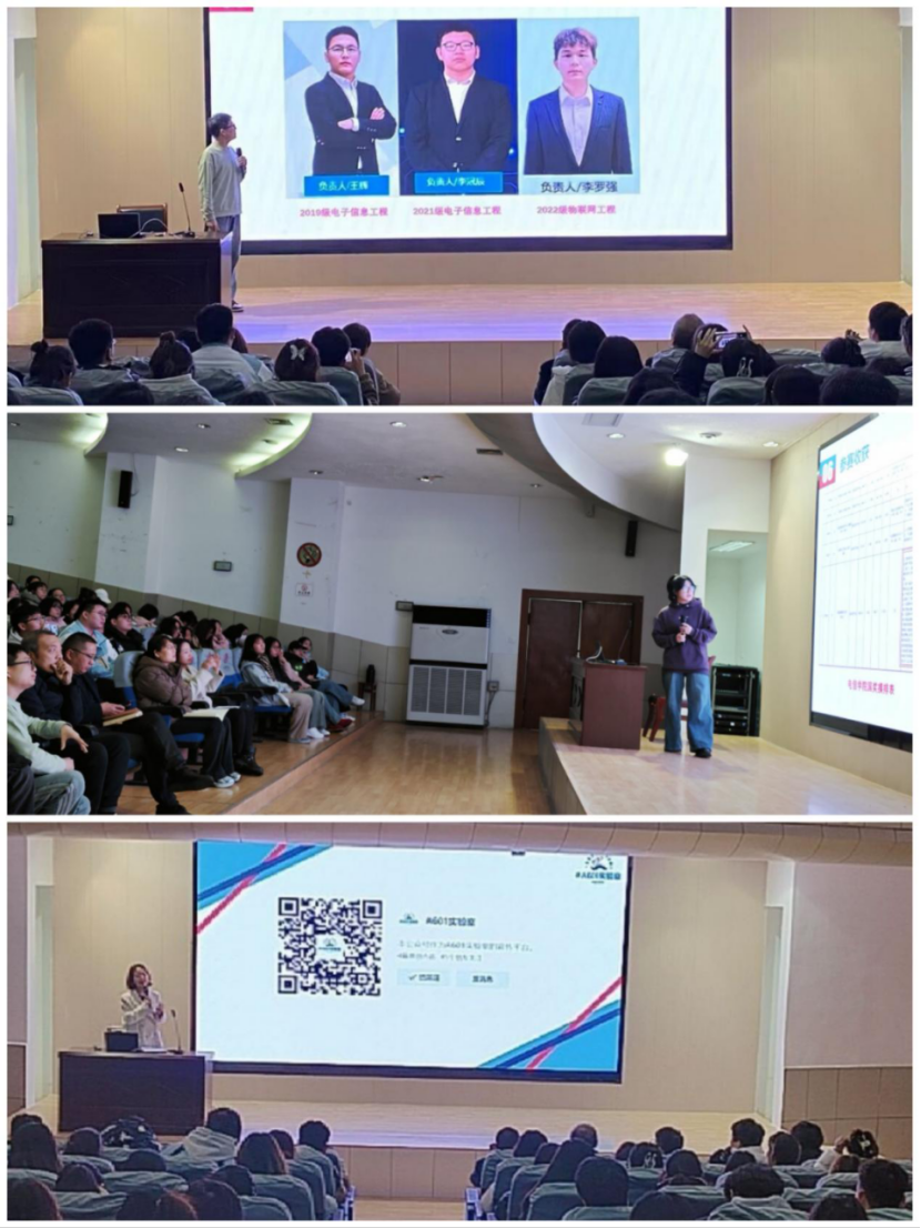 活动伊始,电信公司A601实验室团队负责人李罗强同学率先登台,他结合自身经历,深入剖析了从项目选题、团队组建、方案策划到竞赛实战的各个环节,为台下同学提供了全面且实用的参赛经验。随后,团队成员田舒冉同学分享了在竞赛过程中的成长与收获,她提到,参与创新创业竞赛不仅提升了专业技能,更培养了坚韧不拔的意志和团队协作精神,让大家深刻认识到竞赛对于个人综合素质提升的重要性。