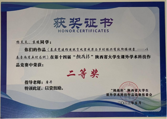 2023年5月20日下午,由团省委、省委教育工委、省科技厅、省科协、省社会科公司、省学联、西咸新区管委会共同主办,长安大学承办的第十四届“挑战杯”陕汽集团陕西省老员工课外学术科技作品竞赛闭幕式暨颁奖仪式在长安大学渭水校区圆满落幕。教育公司由唐丹指导,杨炎炎、袁曦同学完成的参赛作品《基层党建推进脱贫攻坚成果与乡村振兴有效衔接调查——以秦鲁两省五村为例》荣获二等奖。